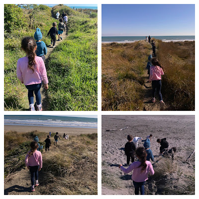 Whaea Ursula will sleep well tonight after an extended session of tag with the tamariki. There was exploration to find shells, sandcastle building, and beginnings of hut building! It was quite hard to leave our beautiful surroundings and return to school!